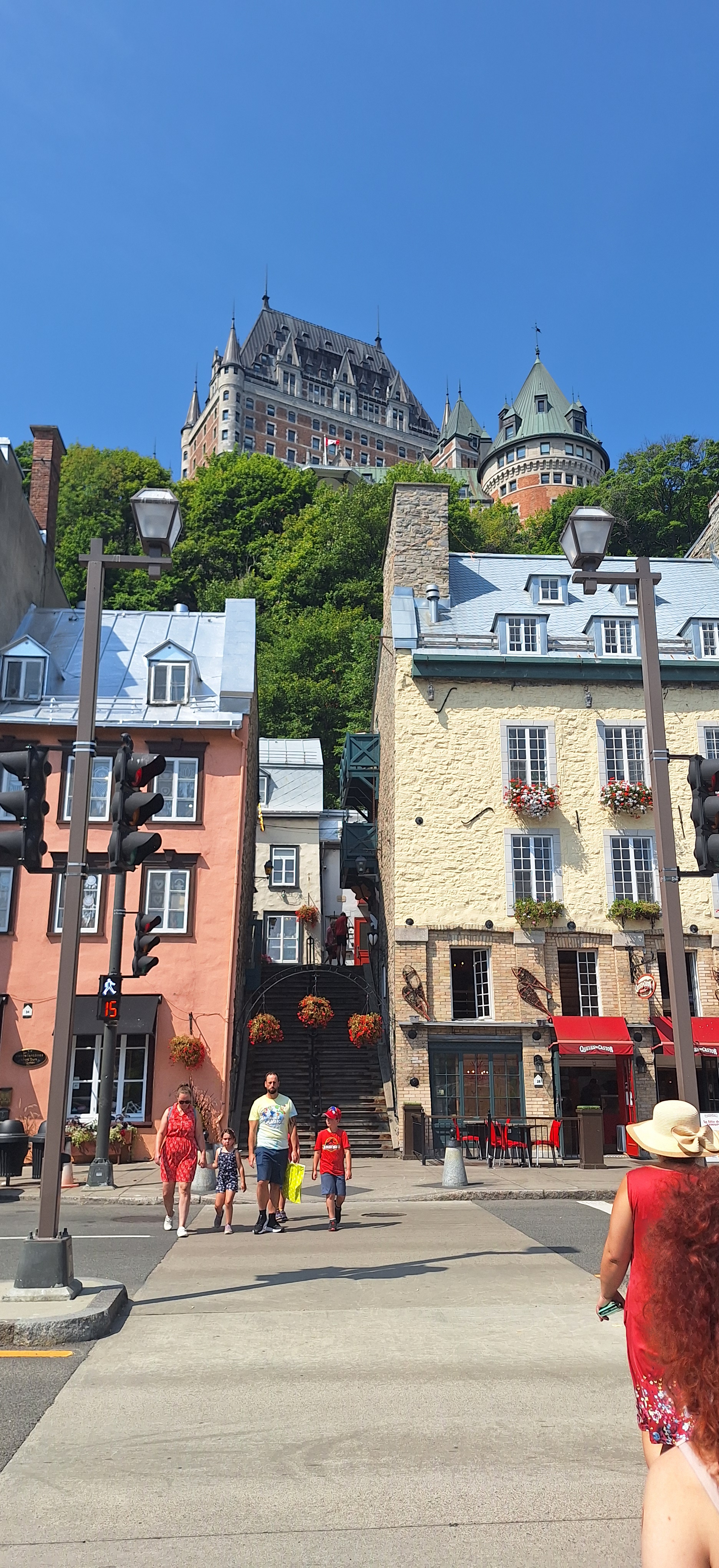 Daar hebben we geen spijt van gekregen. Québec heeft een prachtig oud centrum en ligt op een hoge heuvel aan de St. Lawrence River, zodat je een wijds uitzicht hebt over de immense riviermonding. Op de foto staat kasteel Frontenac (nu een hotel). Bij de stad is een spectaculaire waterval, die van Montmorency.