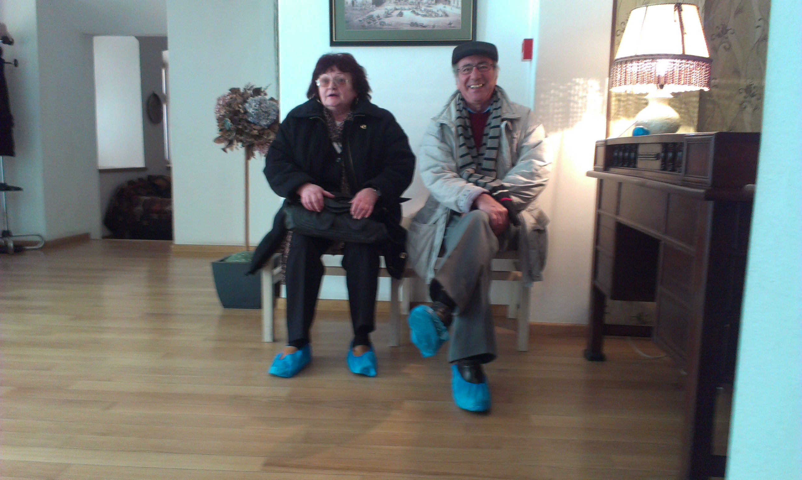 Paul en Maia in het stadsmuseum (Brașov was al in de Middeleeuwen een bloeiende handelsstad, toen Boekarest nog maar een dorpje was), waar we ter bescherming van het parket aan de plastic slofjes moesten geloven.