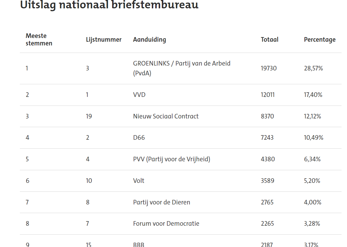 Dat blijkt uit de gegevens die de gemeente Den Haag, als aangewezen orgaan voor het regelen van de briefstemmers, heeft verzameld en gepubliceerd op https://www.denhaag.nl/nl/verkiezingen/kiezers-buiten-nederland/uitslag-nationaal-briefstembureau/