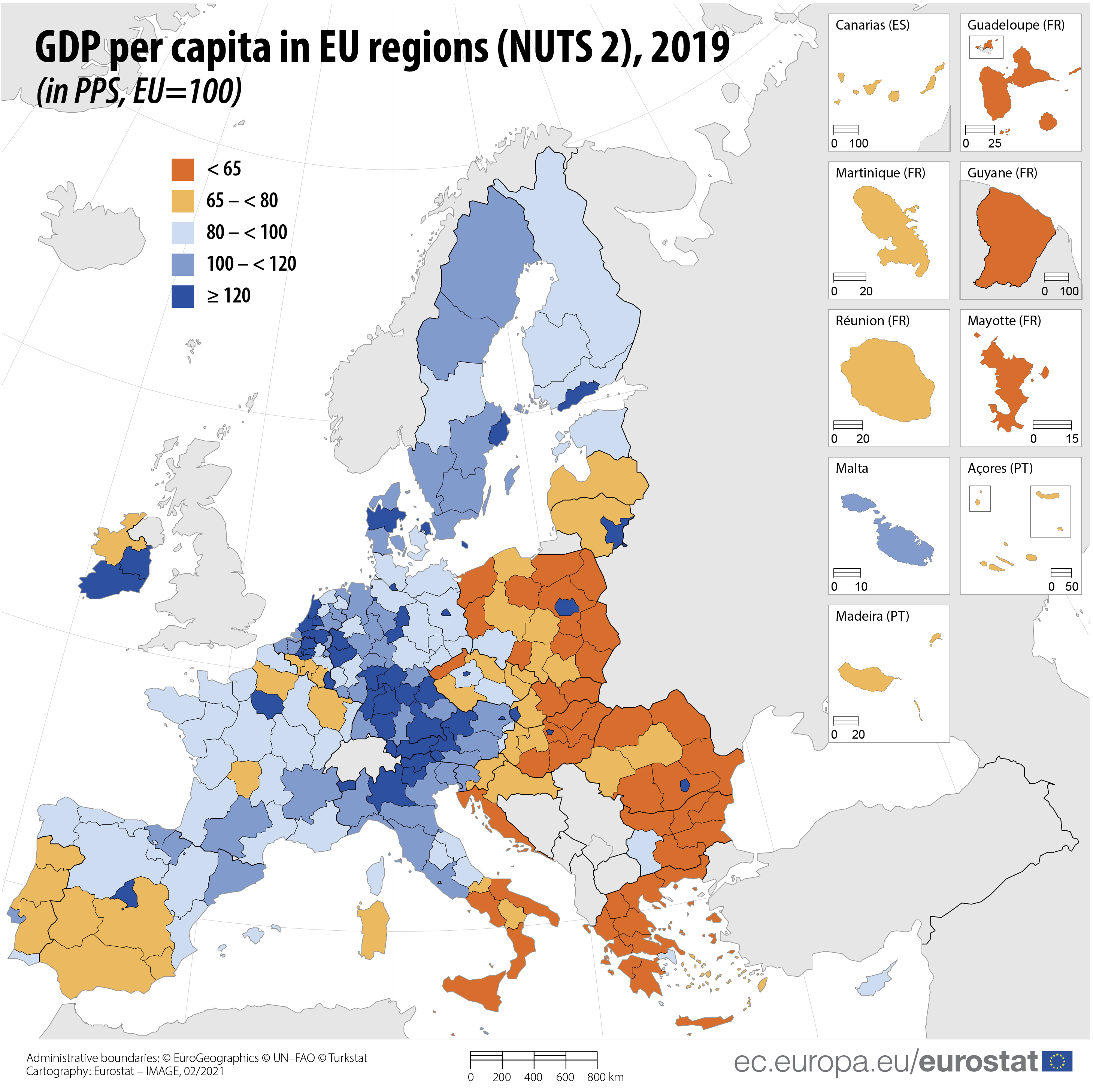 Op het bovenstaande kaartje is te zien hoe de regio Boekarest en het directe ommeland een flink hoger gemiddeld inkomen per hoofd van de bevolking heeft dan het Europese gemiddelde. In de supermarkt betaal je trouwens ongeveer evenveel als in Nederland, dus dat hogere inkomen gaat deels op aan hogere kosten.